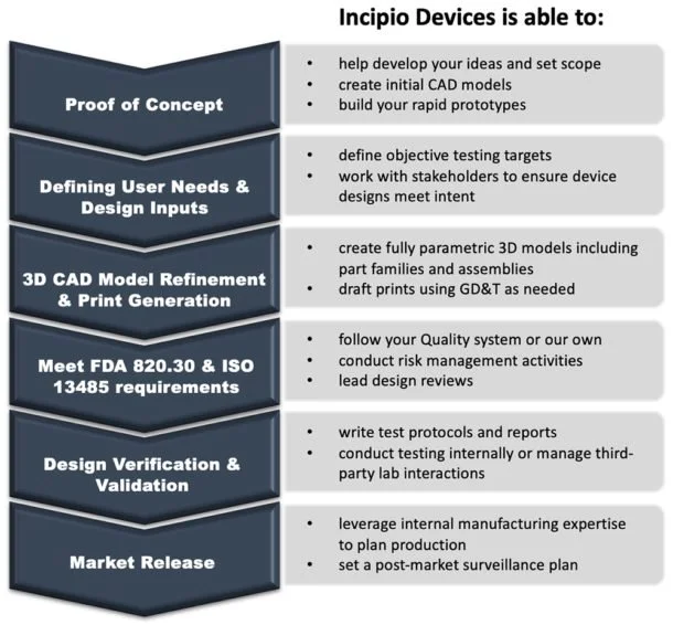 The core team approach allows Incipio Devices to provide a self-sufficient group resource that internally manages personnel and skill sets to most effectively deliver on stated objectives. Each member of the team has the background and talent to drive all aspects of product development and launch. For any given project, Incipio Devices will leverage the combined resources of the core team to support the project needs.
